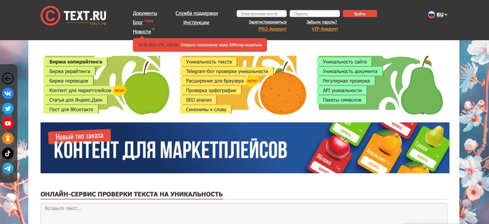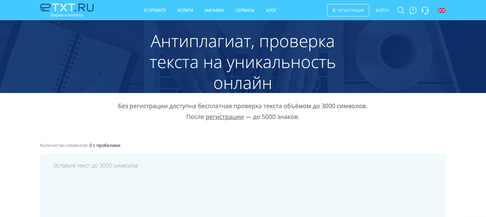 Изначально «eTXT» — это биржа контента, где можно найти копирайтеров, переводчиков или купить готовые статьи для своих сайтов. Помимо этого, платформа развивает свои сервисы, среди которых есть и проверка на антиплагиат. Сделать это можно двумя способами: скачать программу AntiPlagiarism.NET на компьютер или проверить уникальность онлайн. Программа пользуется алгоритмами «eTXT» и позволяет анализировать статьи бесплатно, однако объем ежедневных проверок ограничен нагрузками на серверы. Если нужно проанализировать небольшой отрывок, можно сделать это онлайн. Лимиты: