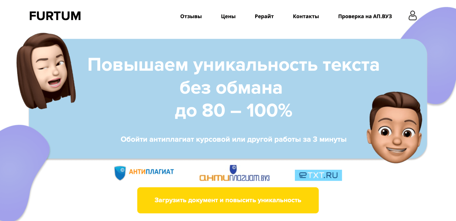 Сайт с приятным интерфейсом, который помогает студентам повысить уникальность. Как и большинство сервисов в этой нише, он анализирует работы в трех системах: