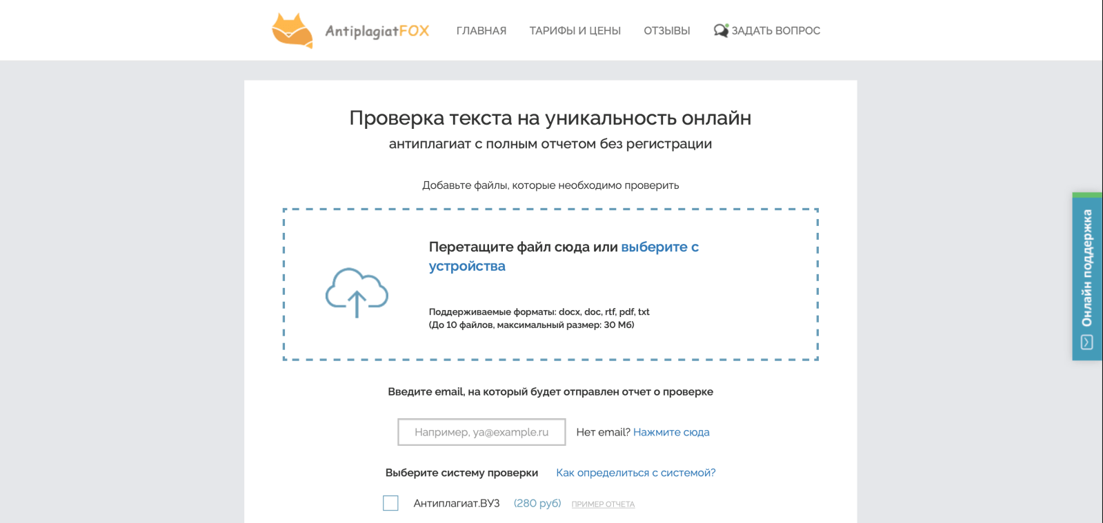 Одна из популярных платформ, которая объединяет несколько сервисов проверок в одной. Чтобы узнать свой результат, нужно загрузить файл, ввести e-mail, выбрать системы и оплатить. Помимо анализа, на сайте «Антиплагиат Фокс» вы можете заказать услугу уникализации.