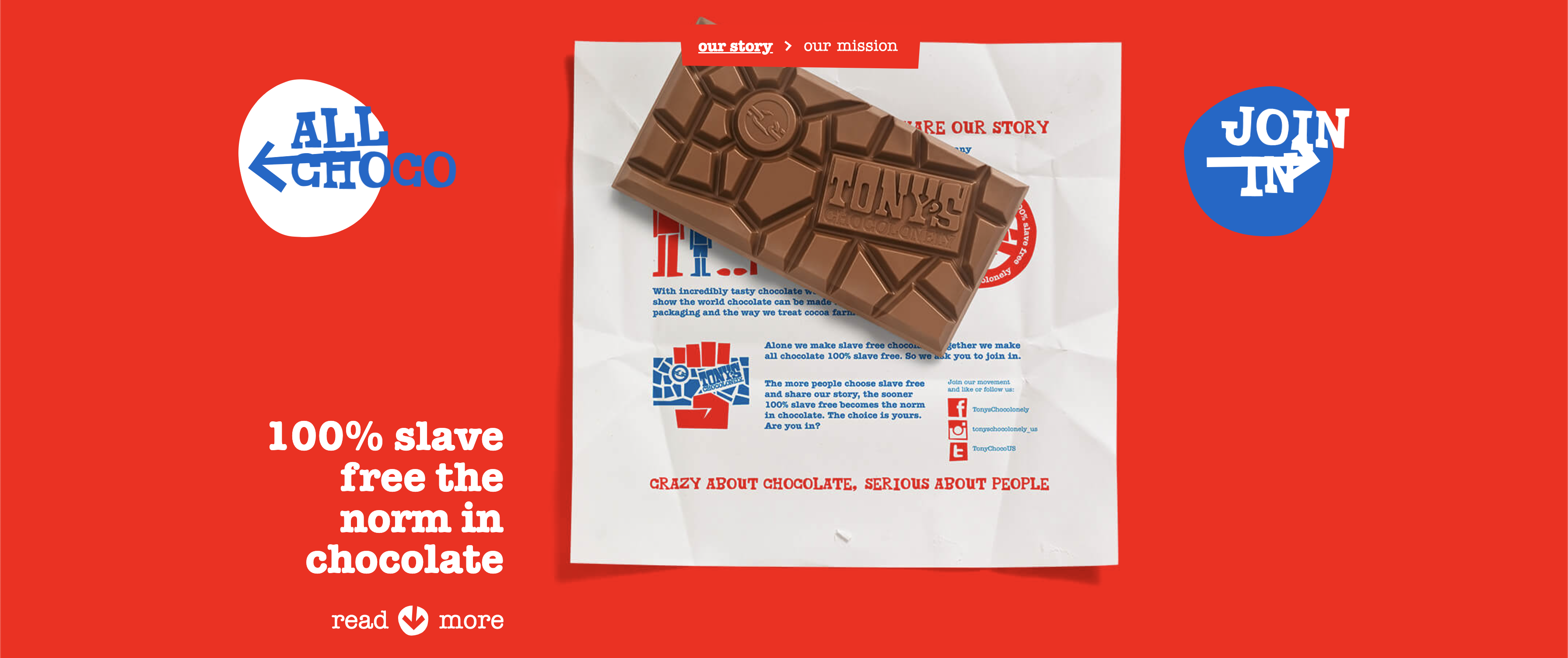 Например, мало кто знает, что большинство какао-бобов, которые используются в шоколадках, добыты рабским трудом африканцев. Голландская компания Tony’s Chocolonely борется с этой проблемой и рассказывает об этом в рекламе. Когда вы разворачиваете шоколадку после покупки, на внутренней стороне вы увидите истории о том, как страдают люди и почему важно бороться с рабством. На плитке есть значок разорванной цепи как символ. Так, с помощью сторителлинга компания демонстрирует свои ценности свободы и усиливает эмоциональную связь с аудиторией.