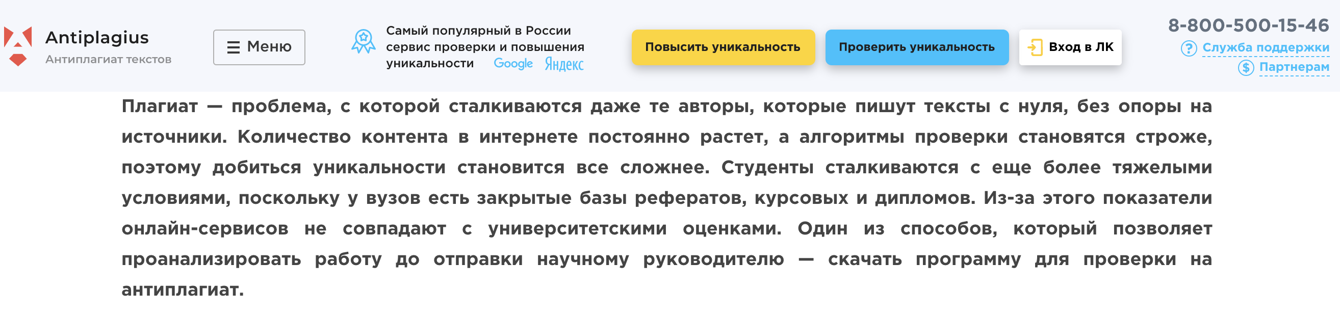 Чтобы упростить сложный этап редактирования, вы можете проверить текст с помощью сервисов. Например, проверить уникальность поможет Антиплагиус. Если статья для публикации меньше 15 тысяч знаков, вы можете бесплатно проанализировать ее на платформе.