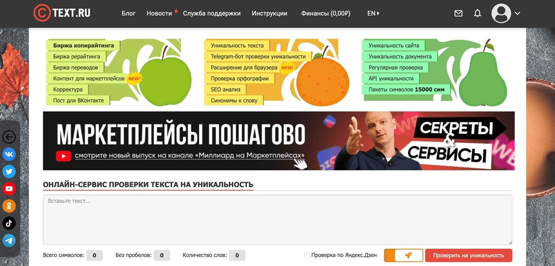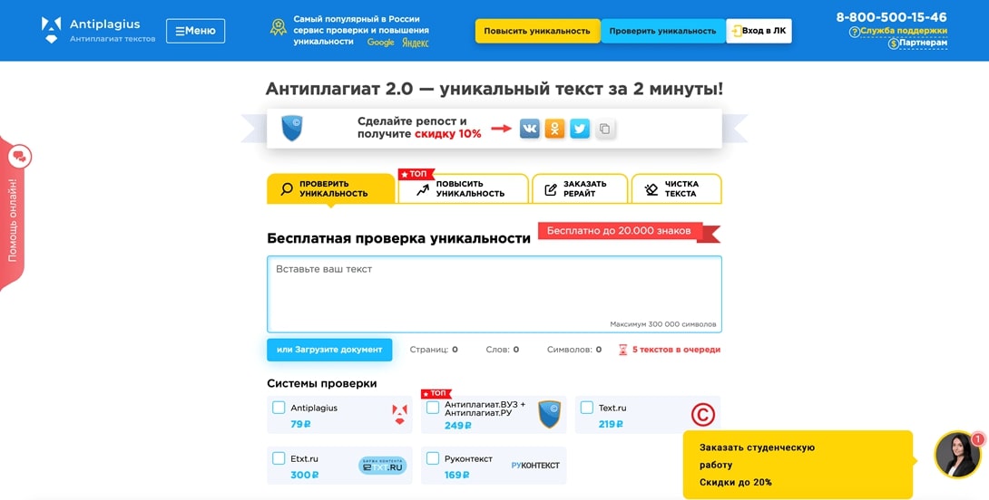 Одна из наиболее часто упоминаемых платформ для проверки. Раньше система была полностью бесплатной, однако сейчас даже у зарегистрированных пользователей есть лимит в виде 15 000 знаков в сутки. Для проверки диссертации нужно оплачивать пакеты дополнительных символов. Обычно объем работы не превышает 200 000 знаков, а это стартовый тариф — 150 рублей.