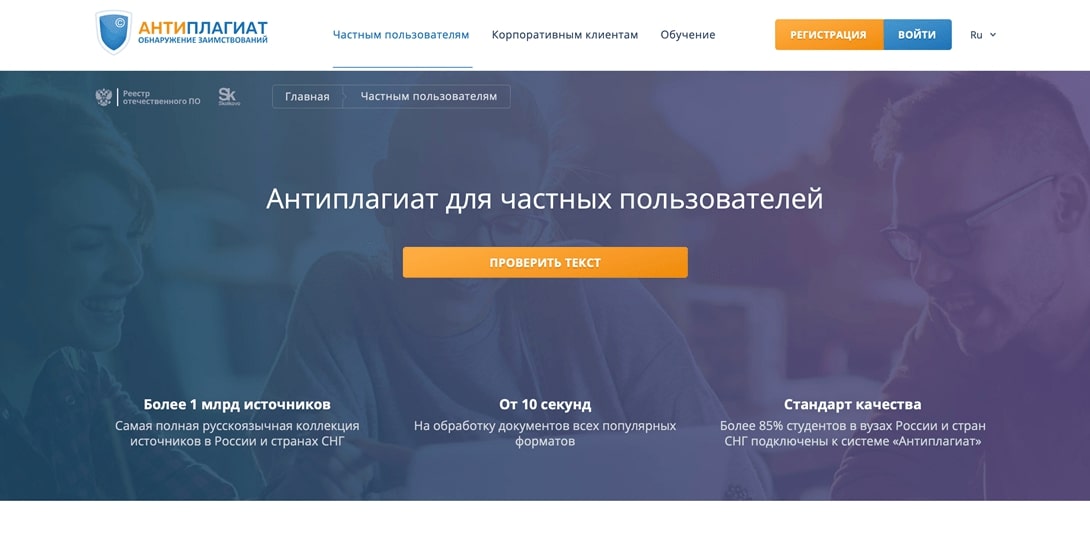 Это самая популярная система, которую использует большинство вузов. У нее есть две версии: .РУ — доступна всем, а .ВУЗ — закрытая. Различия между ними только в количестве доступных модулей и функций проверки. Бесплатная версия позволяет проверить диссертацию, ограничений по объемам нет. Однако она ограничена. Вы получаете только оценку и три ссылки на источники, в которых сервис нашел скопированные фрагменты. По объемам файл не должен превышать 15 МБ, а форматы ограничены двумя вариантами — TXT или PDF. Работа сравнивается только с интернет публикациями.