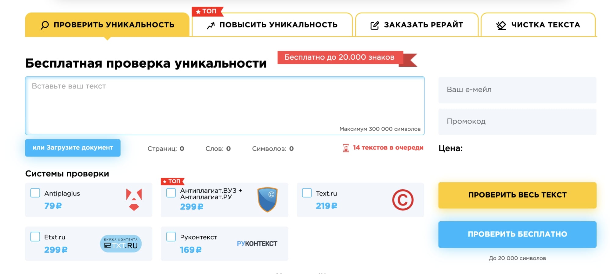 Каждый диплом проходит проверку на закрытой программе Антиплагиат.ВУЗ. Написать оригинальный текст, который алгоритмы не распознают как плагиат становится всё сложнее, поскольку базы ежедневно пополняются студенческими и научными работами. Перед отправкой вы не можете проверить ее самостоятельно, доступ к ней есть только у преподавателей. Учащимся рекомендуют ее аналог — Антиплагиат.ру, однако их оценки могут сильно отличаться, особенно при использовании бесплатной версии. Получить доступ к преподавательскому отчету можно на платформе Antiplagius. Здесь вы можете загрузить свой документ, узнать уровень уникальности и посмотреть на те фрагменты, которые подсвечиваются как заимствования.
