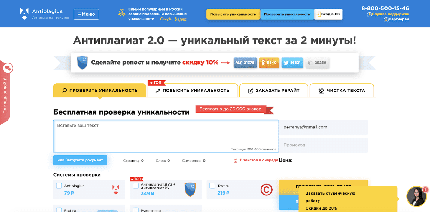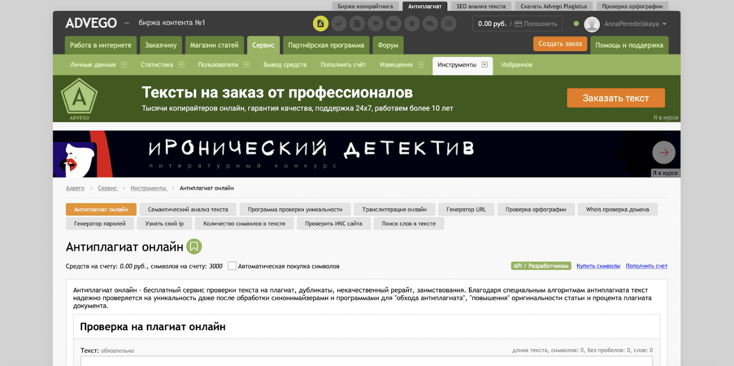 Среди систем для копирайтеров, эта наиболее полезна для студентов. После регистрации вам доступно больше символов — 15 тысяч. Ее удобно использовать при написании работы, например, сегодня вы написали пару параграфов для курсовой — сразу же проверьте их.