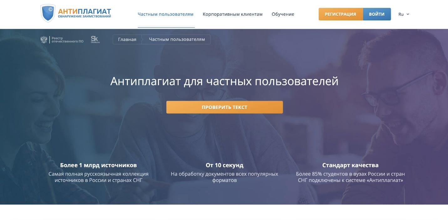 Во многих вузах у преподавателей есть доступ к закрытой системе проверки — Антиплагиат.ВУЗ. У студентов нет к ней доступа, поэтому проверять нужно в альтернативных сервисах. Нередко их результаты принципиально отличаются. Это связано с алгоритмами и базами для сравнений. Наиболее популярные сервисы: